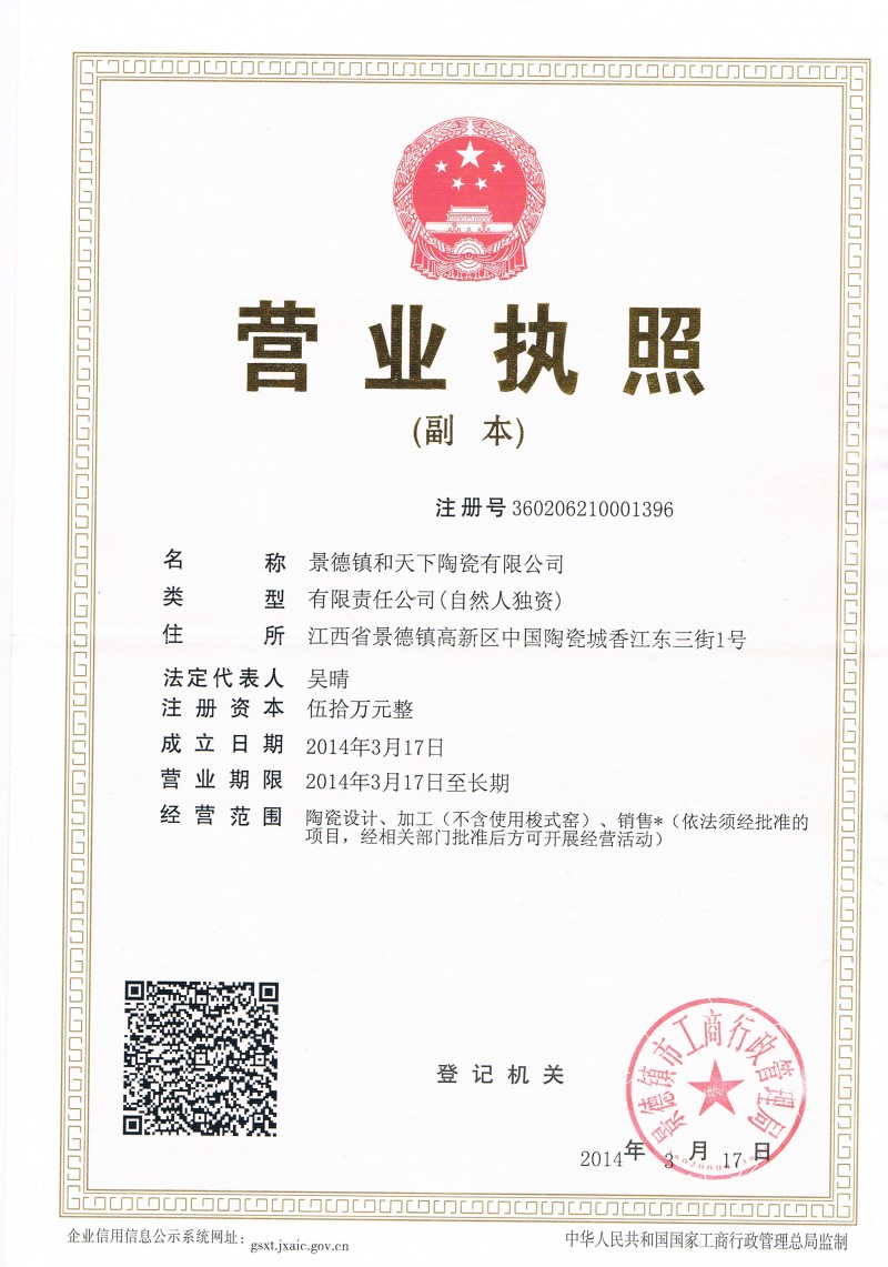 | 發(fā)證機(jī)構(gòu): | 江西省景德鎮(zhèn)市工商行政管理局 | 發(fā)證時間 : | 2014-03-17 |