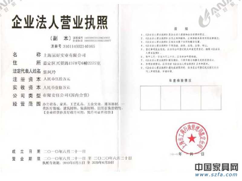 證書(shū)介紹 上海冠好家具公司的營(yíng)業(yè)執(zhí)照。 證書(shū)圖片 |