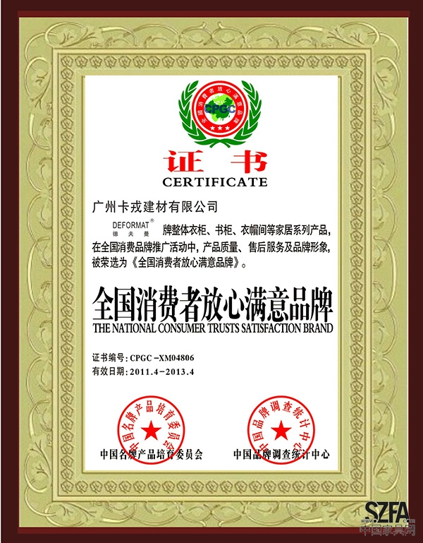 證書介紹 德夫曼衣柜在品牌的推廣之路中,衣柜,衣帽間等產(chǎn)品得到了大眾的認(rèn)可,故被評(píng)為全國(guó)消費(fèi)者滿意放心品牌。 證書圖片 |