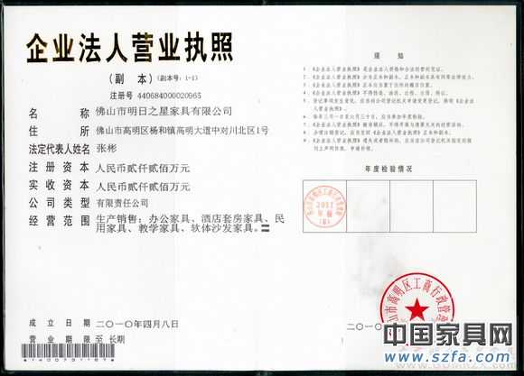 榮譽(yù)資質(zhì) 佛山市明日之星家具有限公司營業(yè)執(zhí)照
