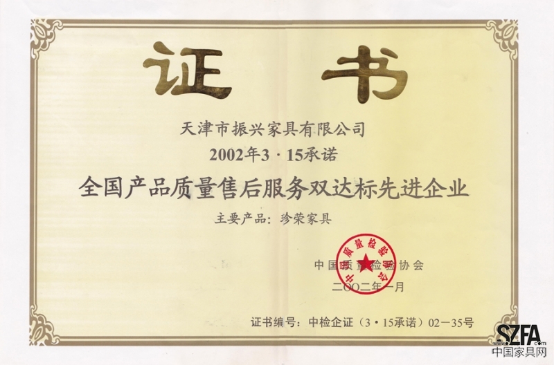 天津市振興家具有限公司 2002年3·15承諾 全國產品質量售后服務雙達標先進企業(yè) 主要產品:珍榮家具 中國質量檢驗協(xié)會 2002年1月 證書圖片 |