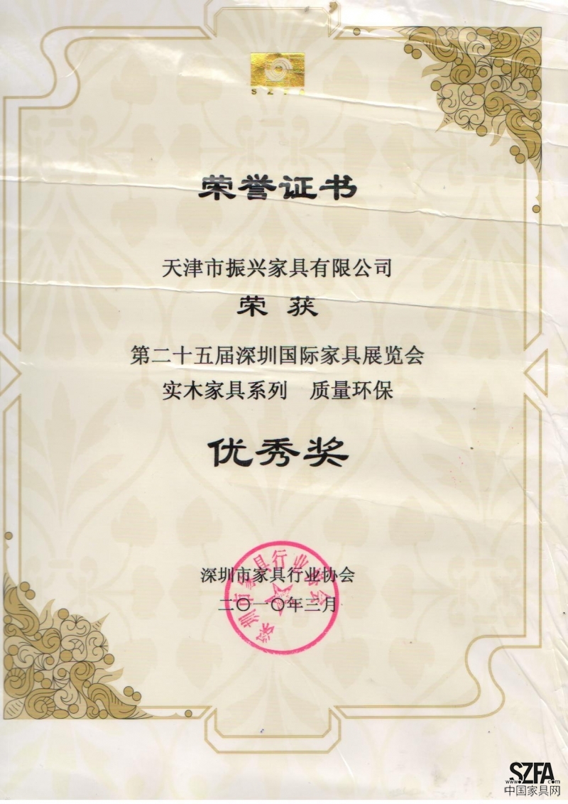 榮獲第二十五屆深圳國際家具展覽會實木家具系列“質(zhì)量環(huán)保”優(yōu)秀獎。