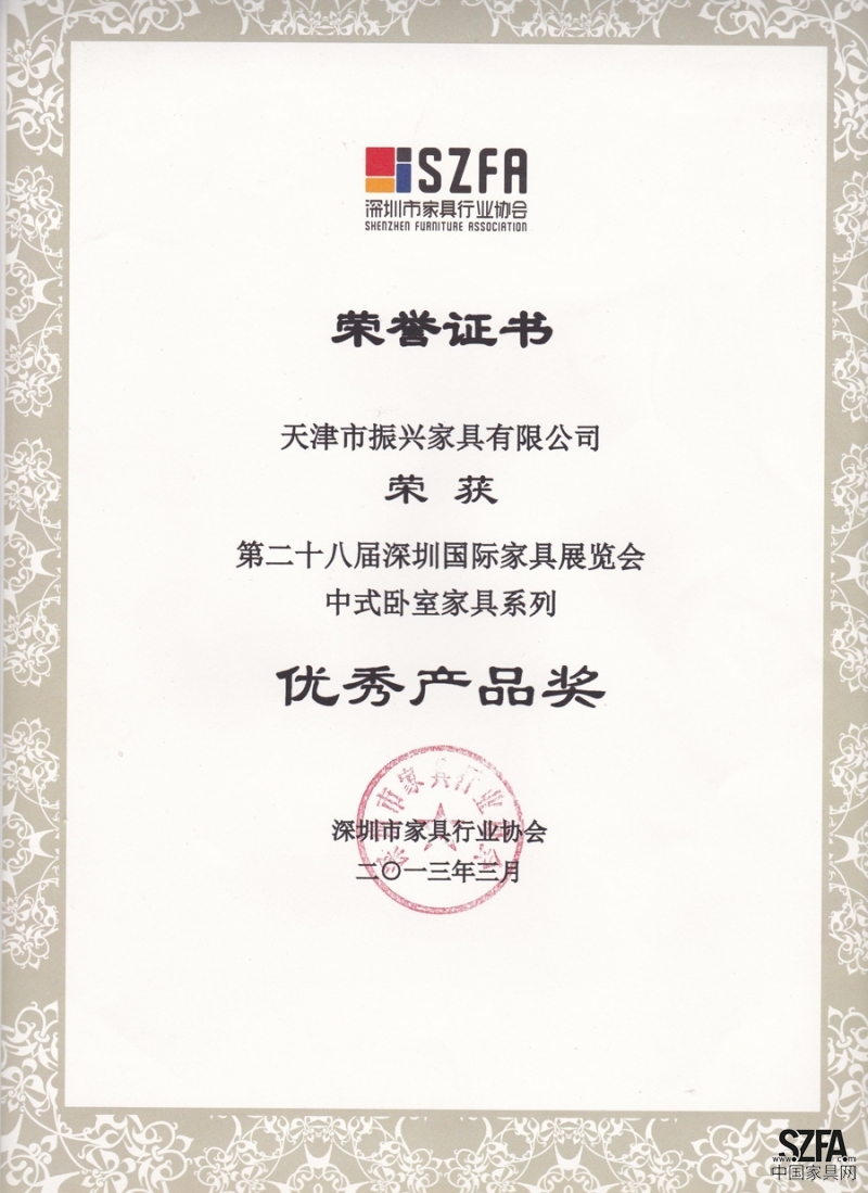 榮獲第二十八屆深圳國際家具展覽會中式臥室家具系列“優(yōu)秀產(chǎn)品獎”。 深圳市家具行業(yè)協(xié)會證書圖片 |