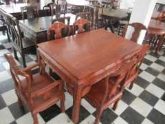 面下劈料式沿,束腰,下承托腮,牙條滿飾象紋,兩側(cè)為透雕象頭紋托角牙。方腿拱肩部亦飾象頭紋,與牙條抱肩榫相交,方直腿,象蹄。四周分有六張椅子,“王冠”式靠背上雕象頭案,椅座下劈料式沿,象式直腳相連于椅座,盡顯王者風(fēng)范。