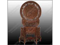 該地鏡、屏風(fēng)采用上等緬甸花梨木制成,屏心與臺架為分體式。圓形屏心采用同心圓設(shè)計。外圓邊緣雕飾如意紋,內(nèi)圓與外圓透雕拐子紋相接,內(nèi)圓中心飾龍鳳呈祥圖。圖案為一龍一鳳,古人認(rèn)為,龍為百獸之王,鳳為百鳥之王。龍鳳出現(xiàn),天下就會祥和太平,百業(yè)興旺,五谷豐登,百姓就能安居樂業(yè),幸福美滿。千百年來,龍鳳就是人們心目中的吉祥之物,是中華民族吉祥和平的象征。站牙透雕立龍,立體感強(qiáng),盡顯威武之態(tài)。
