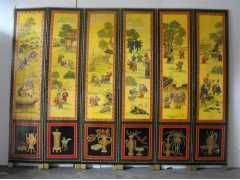 【產(chǎn)品工藝】純手繪漆畫屏風(fēng),堆金手法,畫面凸出有浮雕效果,貼金、銀箔工藝