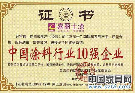 嘉麗士攜手國(guó)際巨星李冰冰打造高端家具漆品牌,在2009年、2010年、2011年由多家權(quán)威機(jī)構(gòu)舉辦的線上線下評(píng)選活動(dòng)中多次榮獲十佳木器漆品牌。