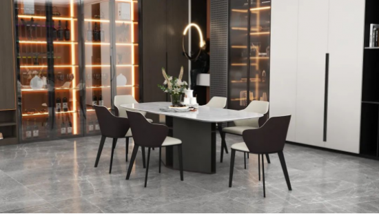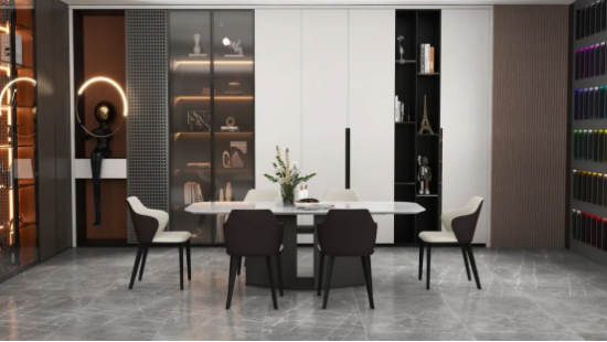 CBD家居·黑金 | HZ201餐臺,潤白大理石臺面清新雅致,幾抹水墨紋營造古韻,方形設計邊角圓弧化處理,增添人文關懷,為用餐時光注入更多溫情,舒享三餐四季。