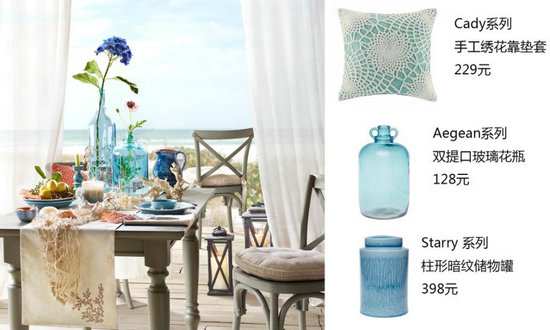 兩個色彩冷暖融匯,重點出現(xiàn)在Harbor House家紡和飾品中。多款美式靠墊、花瓶、毛巾和首飾盒春夏新品,都采用大面積純色,綴以水洗、立體繡花等工藝,凸顯色彩本身的自由與溫柔。在美式床品設(shè)計上,則主要運用珊瑚、海葵、繁花圖案,點睛休閑家居搭配。