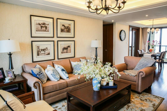 軟裝過程中,色彩搭配決定了居室整體氣質。美式風格傾向于沉穩(wěn)的濃色,如咖啡色、深桃花芯色,來奠定優(yōu)雅基調。對中小戶型而言,設計師點綴藍、白、綠、黃、粉等活力色彩,利用靠墊、擺件、花瓶等潮流單品,中和家具基調,能為中小空間帶來一份輕盈。