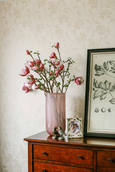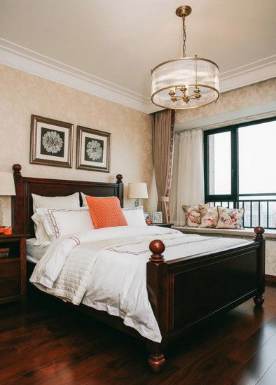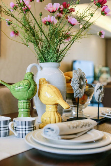 在基調沉穩(wěn)的餐廳以及臥室中,色彩鮮艷的仿真綠植及黃色、綠色小鳥擺件,緩和了美式家具的“濃妝”,為空間融入些許海洋、自然原野的風味,更添趣味性。