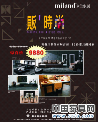 此次“販時尚”活動將于4月20日至5月2日全國米蘭家居專賣店同步啟動,詳情可咨詢米蘭家居各專賣店或撥打全國服務熱線400-000-3328。