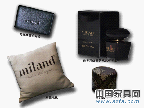 不僅如此,米蘭家居鄭重承諾,活動期間為回饋廣大客戶的支持與厚愛,凡在米蘭家居專賣店消費達5000元,即可獲贈一份價值388元時尚禮盒套裝(世界頂級名牌香水和商務真皮名片夾)