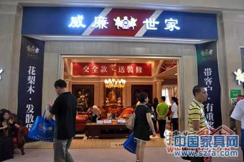 威廉世家干脆將自己的展位門頭做成了對聯(lián),上聯(lián):“花梨木·發(fā)散貨”,下聯(lián):“帶客戶·有中獎”,橫批:“交全款·送裝修”。