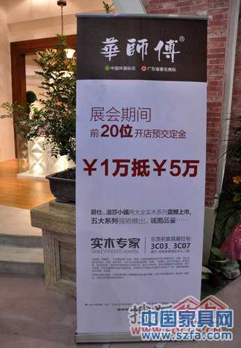 華師傅家具在展會期間打出前20位開店預(yù)交定金,1萬可抵5萬的招商口號。關(guān)鍵詞:展會期間、前20位、1萬抵5萬,這樣的口號吸引老經(jīng)銷商應(yīng)該沒問題。
