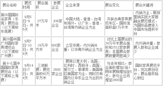 通過(guò)這個(gè)表格的信息,我們可以明顯看出三大展會(huì)之間的趨同和變化。上海展立足華東,以外銷和引進(jìn)國(guó)際品牌為主,這點(diǎn)與廣東家具展的“內(nèi)外銷并重”的理念實(shí)則一致。同時(shí),今年?yáng)|莞家具展擴(kuò)大國(guó)際館面積至1萬(wàn)平方米,加大國(guó)際品牌在展會(huì)上的呈現(xiàn)力度。三個(gè)展會(huì)不約而同地將家具的國(guó)內(nèi)外品牌放在同一個(gè)平臺(tái)展示,由此說(shuō)明國(guó)際品牌進(jìn)入中國(guó)市場(chǎng)的愿望和趨勢(shì),同時(shí)中國(guó)市場(chǎng)變身“世界市場(chǎng)”的趨勢(shì)也在加劇,中國(guó)家具行業(yè)面臨的競(jìng)爭(zhēng)也將日趨激烈。