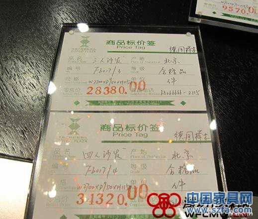 當(dāng)日上午,記者走訪了我市幾家大型家具賣場發(fā)現(xiàn), 各賣場使用的價簽樣式并不統(tǒng)一, 分別有產(chǎn)品名稱、 商品編號、 規(guī)格尺寸、 等級、 產(chǎn)地、 材質(zhì)等信息, 但是不同品牌、 不同品種的家具價簽上標(biāo)示的項目數(shù)量不同,有的只標(biāo)明了價格和產(chǎn)品名稱, 還有的只標(biāo)明了價格和產(chǎn)地, 更有甚者只標(biāo)明了材質(zhì)和規(guī)格尺寸, 任憑商家喊價。