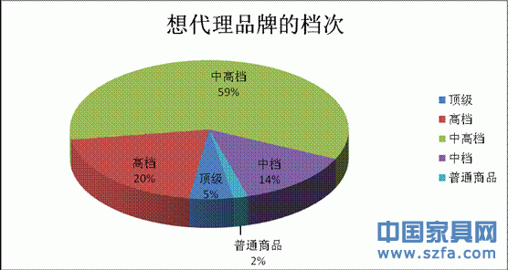 戶外家具在國外屬于大眾消費品,但目前在中國其消費群體仍以高收入人士為主。預(yù)計在未來3-5年內(nèi),普通消費者對戶外家具的需求將會逐漸凸顯。因此經(jīng)銷商在換品牌時不但考慮高端消費者的需求,還會考慮市場的未來發(fā)展趨勢。在欲換品牌的經(jīng)銷商中,欲代理中高檔產(chǎn)品的最多,占59%,因此產(chǎn)品的市場范圍最廣;欲代理高檔、中檔產(chǎn)品的經(jīng)銷商分別占欲換品牌經(jīng)銷商總數(shù)的20%、14%,而有代理頂級產(chǎn)品意向的經(jīng)銷商只占5%,欲代理普通產(chǎn)品的只占2%(圖表一)。