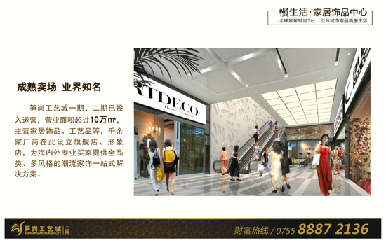 核心提示:筍崗工藝城地處羅湖區(qū)寶安北路與桃園路交匯處,位于政府恢弘規(guī)劃的筍崗家居飾品產(chǎn)業(yè)集聚地核心區(qū)域,自開業(yè)以來獲得了政府、市場和權(quán)威媒體的高度關(guān)注和支持,連續(xù)舉辦了數(shù)屆深圳文博會分會場,并獲得了深圳市重點(diǎn)文化企業(yè)、深圳市文化產(chǎn)業(yè)基地、深圳市文化+旅游型示范園區(qū)等二十余項(xiàng)榮譽(yù)稱號。筍崗工藝城致力于成為國內(nèi)領(lǐng)先、國際化的家居飾品高端專業(yè)市場運(yùn)營商,整體規(guī)劃30萬㎡,將打造成為超大規(guī)模的全球家飾采購中心。
