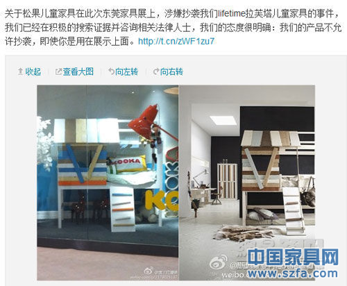無獨(dú)有偶,在澳瑪家具維權(quán)當(dāng)天,也即東莞家具展的最后一天,斯堪維亞丹麥兒童家具官方微博指旗下的"lifetime拉芙塔樹屋"被松果兒童家具抄襲。