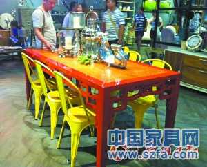 這款餐桌,涂裝典型的中國(guó)紅色彩,腿柱、牙板是傳統(tǒng)的明清式樣,但搭配上單色的檸檬黃椅子,就有活色生香的感覺。何況這些檸檬黃椅子還具有濃郁的現(xiàn)代工業(yè)的味道,使得本來傳統(tǒng)的家具變得簡(jiǎn)約、時(shí)尚,賞心悅目。