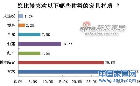 從家具材質(zhì)分析來看,選擇實(shí)木所占比最高,為37.6%。實(shí)木家具以其純天然材質(zhì)自然美觀、綠色環(huán)保、舒適耐用等獨(dú)特優(yōu)勢,倍受消費(fèi)者的喜愛。板門結(jié)合也有不錯(cuò)的表現(xiàn),竹藤材質(zhì)也有14.5%的比例,塑料金屬人造板則少有人問津,紅木家具價(jià)格過高,也有7.5%的朋友喜歡。 新浪家居網(wǎng)