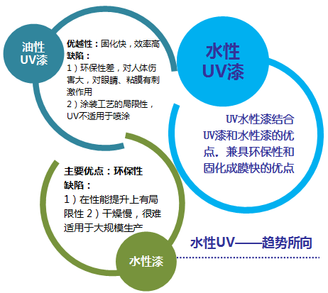 UV漆和水性漆都是環(huán)保漆的兩個(gè)發(fā)展方向,UV光固化體系以其固化速度快、生產(chǎn)效率高、涂層物化性能好等優(yōu)勢(shì),在近多年來得到了高速發(fā)展。但是,傳統(tǒng)的油性UV在應(yīng)用時(shí)存在著局限性:首先從環(huán)保角度,油性UV揮發(fā)性強(qiáng),對(duì)人的眼睛和粘膜有較強(qiáng)的刺激作用,皮膚接觸也易導(dǎo)致過敏。同時(shí)許多油性UV反應(yīng)性稀釋劑在紫外光固化過程中難以反應(yīng)完全,直接影響著固化后產(chǎn)品的衛(wèi)生安全性能。其次從涂裝工藝上看,在噴涂方面一直是油性UV的短板,不管是安全性,環(huán)保等各種因素,傳統(tǒng)的油性UV是很難適用于噴涂的。