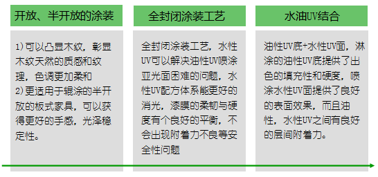 水性UV漆在使用方式上更加靈活,可以適用于噴涂、幕涂、淋涂等,與傳統(tǒng)油性UV相比,可以兼顧硬度和柔韌性。具體特點(diǎn)如圖所示: