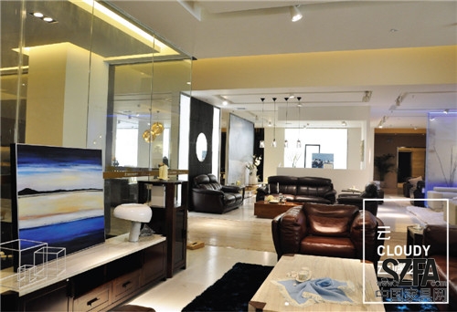 整個空間以藍色和白色為主色調(diào),渲染藍天白云的感覺,巨幅落地畫更加凸顯了這一情緒,棕色和米黃色的沙發(fā)給清冷的基調(diào)注入一股暖流。
