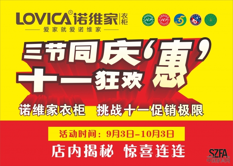 以國慶7天黃金周促銷為標志,各大家居衣柜賣場年末促銷戰(zhàn)全面打響,商家“火力全開”上演促銷攻勢。在這一波促銷大讓利活動中,6年蟬聯(lián)“整體衣柜十大品牌”的諾維家,將攜手全國500多家專賣店,集中廠家、商家的全部人力、物力和財力,輪番上演中秋節(jié)、國慶節(jié)、重陽節(jié)全國聯(lián)動、全員促銷的“三節(jié)同慶,十一狂歡惠——諾維家衣柜中秋·國慶·重陽三節(jié)狂歡促銷”活動,從9月3日一直延續(xù)到10月3日,希望通過開展不同階段的優(yōu)惠活動,讓所有的消費者都享受到諾維家空前的優(yōu)惠及至高的品質(zhì)。