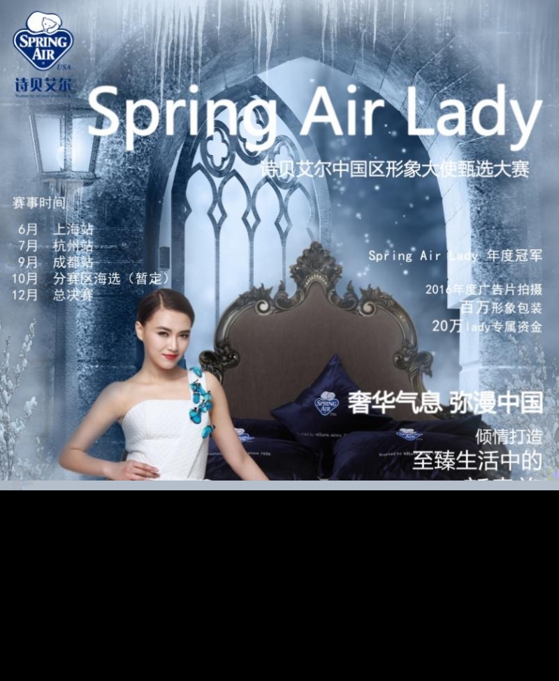 Spring Air詩(shī)貝艾爾創(chuàng)立至今始終致力打造極致睡眠的至臻之選,以其獨(dú)有的低調(diào)奢華氣息,傳遞新貴族生活方式的新主張。Spring Air Lady賽事將這一理念完美呈現(xiàn),為追求時(shí)尚至尊巔峰夢(mèng)想的美麗女孩們撐托起釋放魅力的舞臺(tái)。上海、杭州、成都等地設(shè)立分賽區(qū),為不同地域的美麗女孩提供展現(xiàn)平臺(tái)。并特別邀請(qǐng)2007年環(huán)球小姐中國(guó)區(qū)冠軍魏子雅小姐提供專業(yè)點(diǎn)評(píng),時(shí)尚麗人平臺(tái)“幫美人”為每一位參賽的美麗女孩提供量身獨(dú)制形象造型。