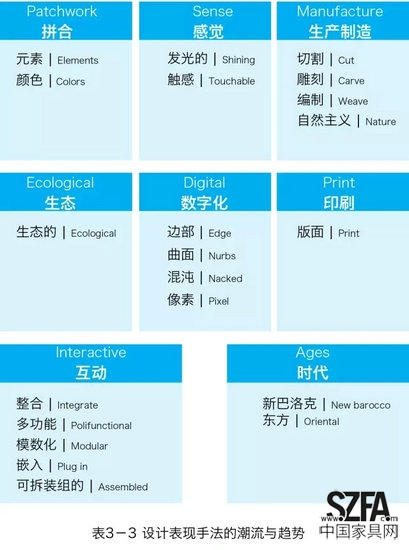 當(dāng)今國(guó)際設(shè)計(jì)在具體的家具表現(xiàn)方面,可以總結(jié)出如以下表格所示的一系列手法。