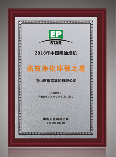 2016年11月29日,中國(guó)五金制品協(xié)會(huì)正式公布了2016年家用吸油煙機(jī)及集成灶“高效凈化環(huán)保之星”產(chǎn)品名單,櫻雪超魔007智能煙感吸油煙機(jī)(CXW-220-Z1601(B)-J),憑借直流變頻技術(shù)、智能煙感技術(shù)、高效環(huán)保節(jié)能技術(shù),獲得了評(píng)審專(zhuān)家的一致認(rèn)可,與方太、老板等知名廚電品牌同獲“高效凈化環(huán)保之星”稱(chēng)號(hào)。