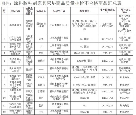 此次抽檢共發(fā)現(xiàn)12批次乳膠漆、墻面漆等涂料不合格,標(biāo)稱商標(biāo)涉及:創(chuàng)美、美獅、豪得邦、家家樂、鑫慕邦、佳寶等。不合格項(xiàng)目主要為“對(duì)比率、耐洗刷性”“壓縮剪切強(qiáng)度-干強(qiáng)度”等。抽檢于西昌市萬利油漆經(jīng)營(yíng)部、標(biāo)稱“廣漢市科宇化工廠”生產(chǎn)的1批次“水晶清面漆”(2017-04-25/201704251),揮發(fā)性有機(jī)化合物(VOC)含量、游離二異氰酸酯(TDI、HDI)含量總和超標(biāo)。