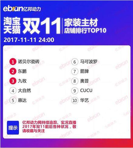 諾貝爾始終是天貓“雙十一”家裝主材的領(lǐng)跑品牌,三年參加“雙十一”活動(dòng),三次大幅刷新銷售紀(jì)錄。2015年,首次參加“雙十一”,全天銷售額7236萬(wàn)創(chuàng)造了天貓家裝類目新紀(jì)錄。2016年攜高端產(chǎn)品瓷拋磚再戰(zhàn)“雙十一”,成為行業(yè)率先交易額破億的企業(yè),最終成交額超過(guò)1.7億。而2017年,更是以4.6億,令人贊嘆。