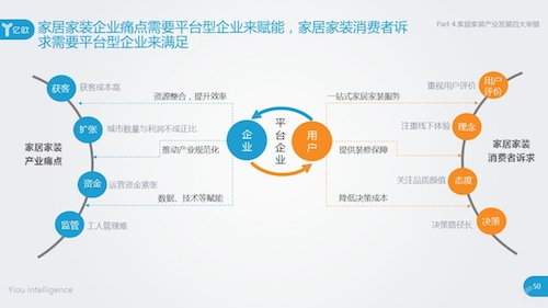億歐智庫認為,當下家居家裝企業(yè)的痛點和消費者訴求,需要大的平臺型企業(yè)來賦能家居家裝企業(yè)和滿足消費者訴求。大平臺可以通過自己擅長的數(shù)據、技術等優(yōu)勢賦能中小企業(yè),讓中小企業(yè)專注自己擅長的事情,通過資源整合,優(yōu)化家居家裝流程,提升效率,推動家居家裝產業(yè)規(guī)范化。同時,家居家裝平臺型企業(yè)可以協(xié)同中小企業(yè)共同服務消費者,為消費者提供一站式家居家裝產品與服務與裝修保障,解決信息不對稱,降低決策成本。
