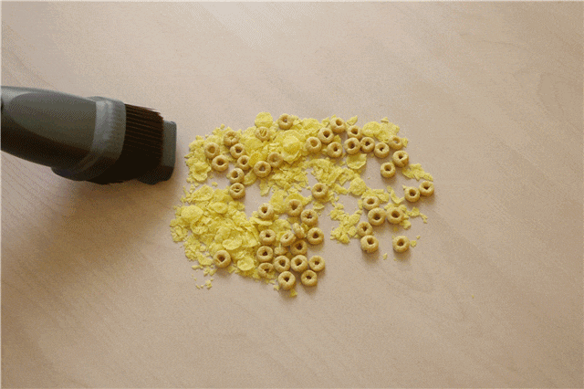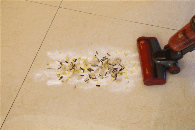 我們將一些顆粒物放置在桌面上,然后選用二合一毛刷進(jìn)行清潔,吸頭走過(guò)垃圾全部進(jìn)入到塵筒中,并未有任何的殘留。