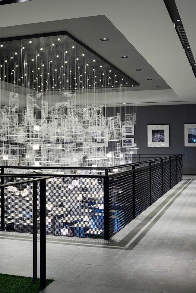 模型區(qū)設(shè)計,在現(xiàn)代的詩意中捕捉到歷史的風韻,大型藝術(shù)燈具是空間的亮點,白色二維碼形狀的燈片組合,錯落起伏排列,構(gòu)建著科技未來感和廣闊遼遠而未知的詩意,沙盤一側(cè)一株花樹正盛放得明媚燦然,讓人想起詩句“花樹得晴紅欲染”。過去、當下與未來,于此再度相會,它們氣韻相連,不容抹去任一方的存在。
