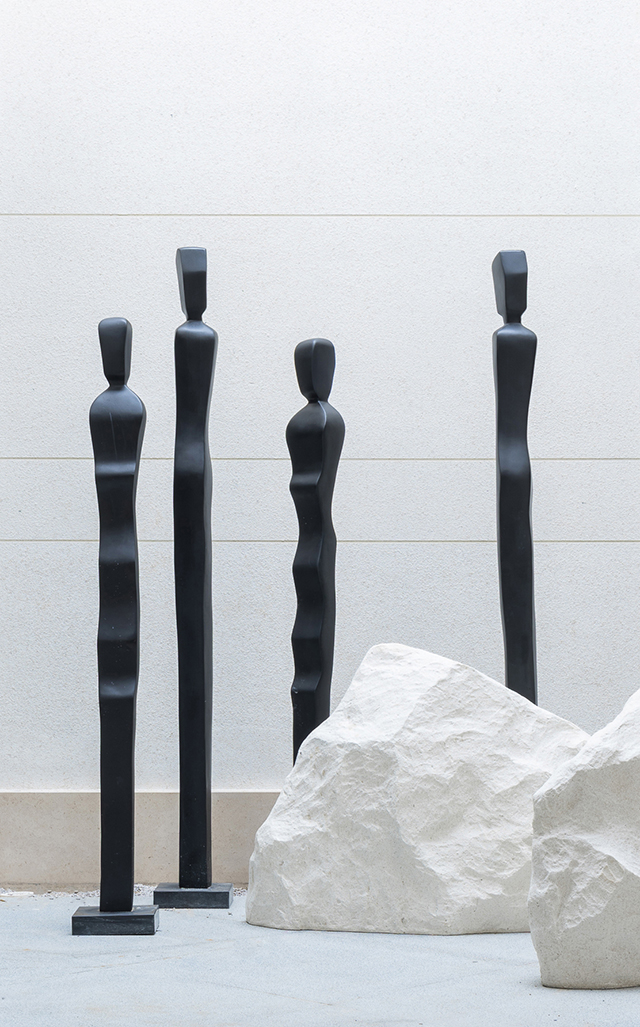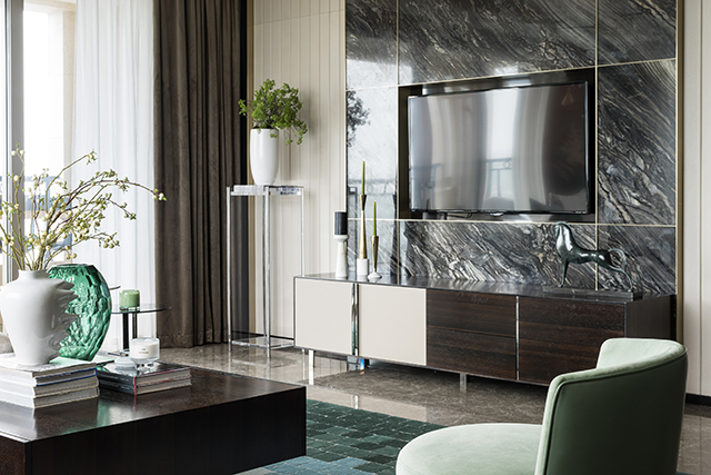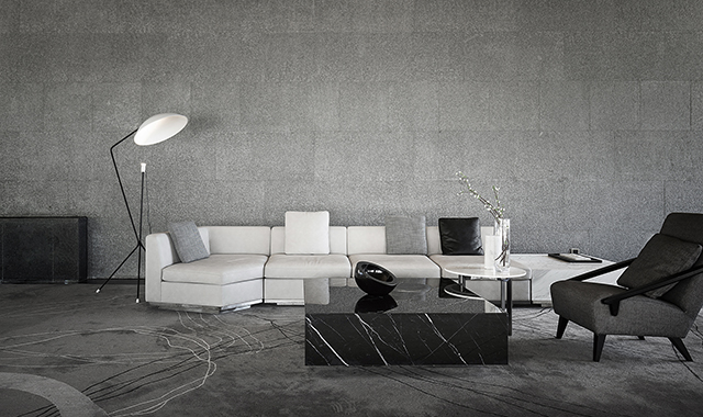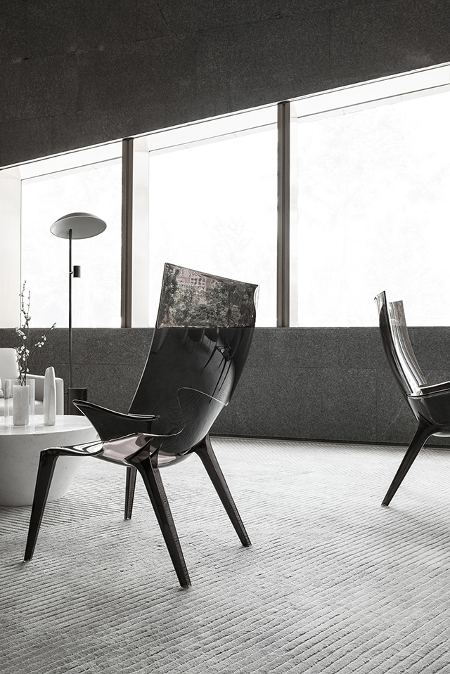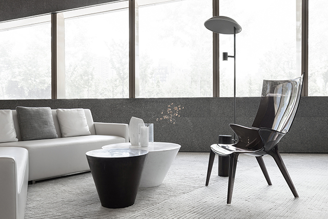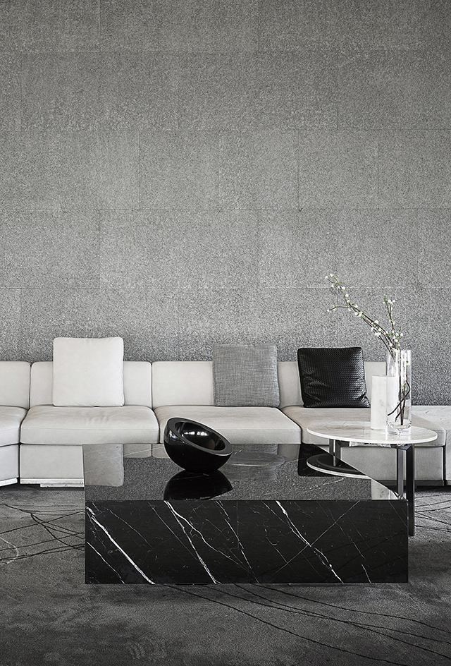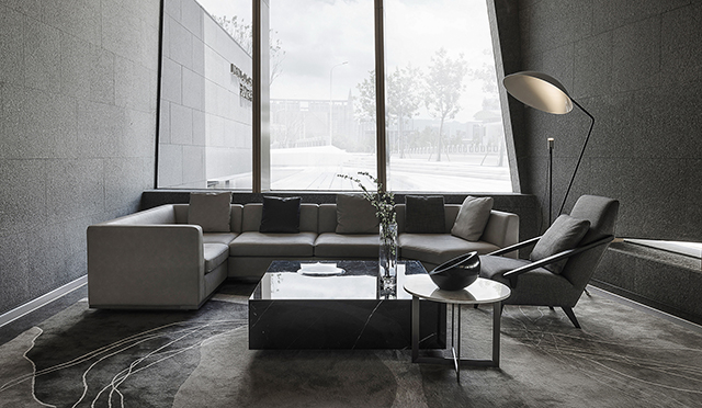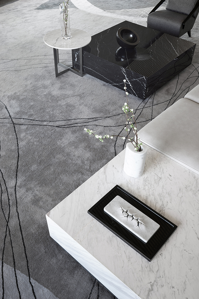 家具造型呼應(yīng)建筑體量的幾何線條感,純白簡灰的極簡色調(diào),與通透的理石臺面、黑色的靜穆搭配,呈現(xiàn)一種堅硬與柔軟并存、光潔與粗重并呈的特殊質(zhì)感。纖柔的花藝同樣以極少的藝術(shù)寂靜地存在,編織出空靈樸拙的安靜感與美。