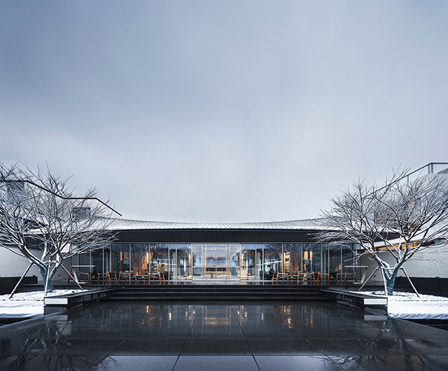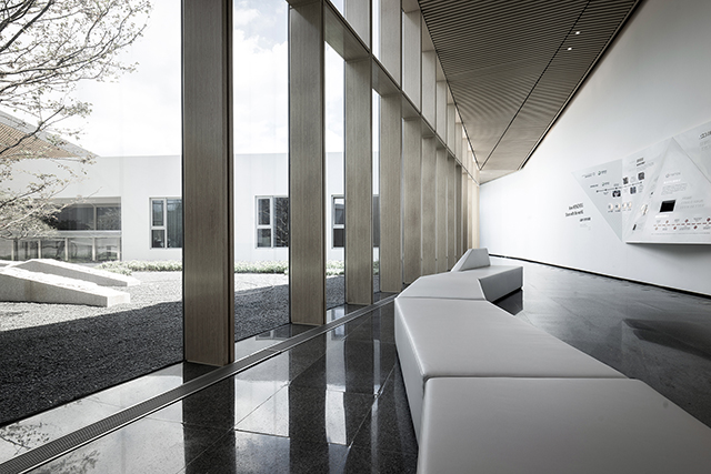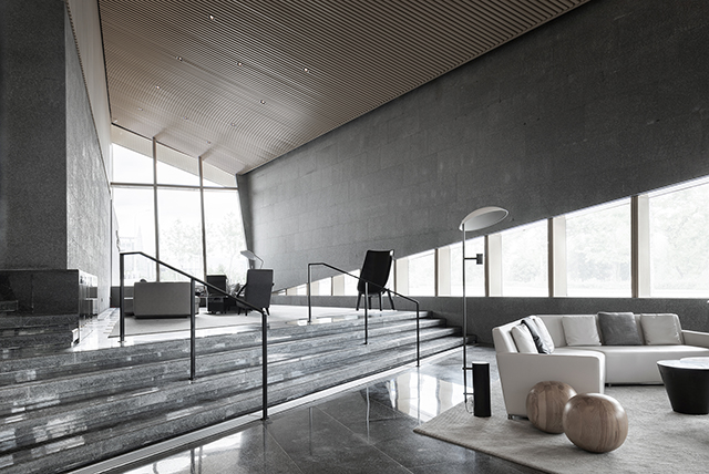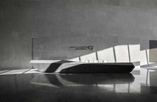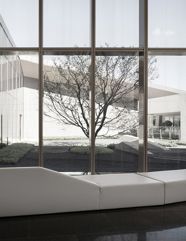 步入館內(nèi),一片沉凝干凈的墻面下,是棱角分明的石材臺面,簡潔明凈、毫無它飾。接待區(qū)右側(cè)挑高的落地玻璃,向自然借景,光影在室內(nèi)自在游走,一種靜謐而無垠廣闊的空間感悄然生發(fā),自然與靈魂得以展開一場細(xì)膩而自在的對話。