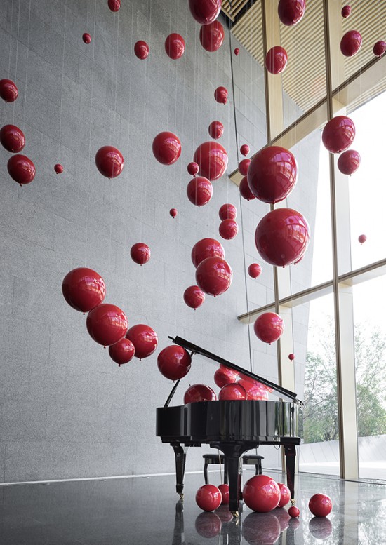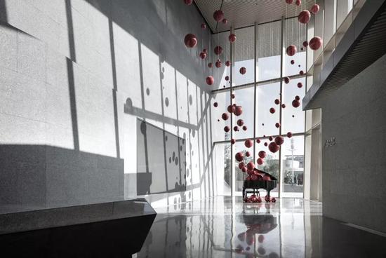 落地窗旁,輕盈的紅色氣球以冉冉上升的姿態(tài),在傾灑的光影下,伴隨著柔和的曲調(diào)盈盈飄動,打破了灰色基調(diào)的視覺塊面??諝庵袕浡两降臐庥羟殂?、微醺的浪漫,調(diào)動著觀者的感官。