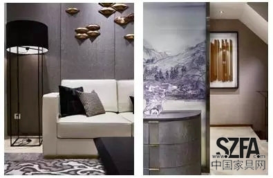 各種精致細(xì)節(jié),不同質(zhì)感的紡織品,典雅深厚的色彩,無一不為這深邃的空間綻放它的美。更是令人驚嘆的是設(shè)計(jì)師選用了元代畫家黃公望的《富春山居圖》作為客廳的彩頭,絕妙之處便是層巒疊嶂之間放置了一尊晶瑩剔透的玉玲瓏,其意境深遠(yuǎn),無法言表。