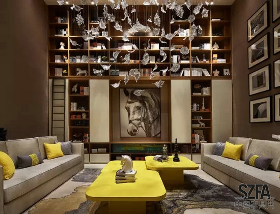 設(shè)計(jì)師利用地下室的優(yōu)勢(shì),為客戶營造了一個(gè)充滿藝術(shù)格調(diào)的會(huì)客區(qū),時(shí)尚休閑,浪漫的水晶燈成了空間的主宰者。在空中,在燈光閃爍間,散發(fā)著陣陣柔美與搖曳;明亮的檸檬黃色,不但讓人精神愉悅,更成為視覺焦點(diǎn),時(shí)尚感十足。