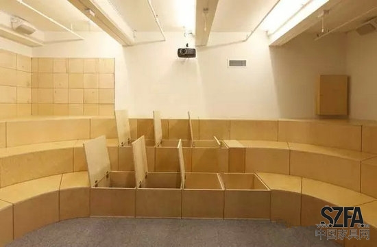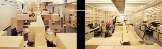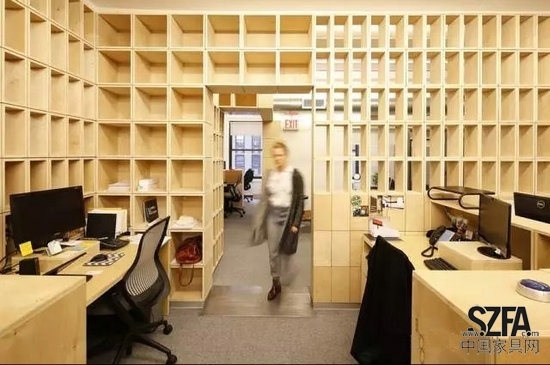 Taylor and Miller為他們開發(fā)了辦公室隔墻和家具系統(tǒng),都是由不同尺寸和直線形狀的基本膠合板箱做成的。由多個隨機的方式安排的盒子組成了隔墻,這樣就允許了空間中的視覺連通性,當移動到新的空間后,原來的盒子被重新組織,用了單一的盒子形狀來搭建整面隔墻。對于設(shè)計師來說,這個想法是:隨著辦公室的擴展,在新的空間里增加了更多的勞動力,在人口密度增加和任務(wù)有重疊的情況下,辦公有一定程度的紊亂,該建筑體系的設(shè)計,將抵消這一混亂走向;盒子的重復(fù)性和紋理將這個工作間與下一個工作間分開,給員工提供了一個安靜的空間和隱私分層。