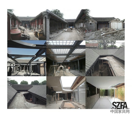 修復舊的。整理和分析現(xiàn)存舊建筑是設計的開始。北側(cè)正房相對完整,從木結(jié)構(gòu)和灰磚尺寸上判斷,應該至少是清代遺存;東西廂房木結(jié)構(gòu)已基本腐壞,用磚墻承重,應該是七八十年代后期改建的;南房木結(jié)構(gòu)是老的,屋頂結(jié)構(gòu)是用舊建筑拆下來的木頭后期修繕的,墻面與瓦頂都由前任業(yè)主改造過。根據(jù)房屋的年代和使用價值,設計采取選擇性的修復方式:北房以保持歷史原貌為主,僅對破損嚴重的地方做局部修補,替換殘缺的磚塊;南方局部翻新,拆除外墻和屋頂裝飾,恢復到民居的基本樣式;東西廂房翻建,拆除后按照傳統(tǒng)建造工藝恢復成木結(jié)構(gòu)坡屋頂建筑;拆除所有臨建房,還原院與房的肌理關系。