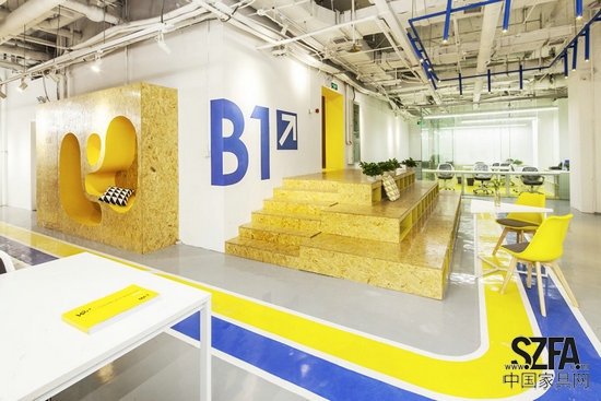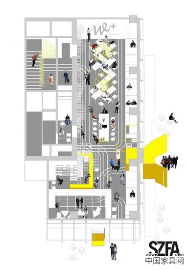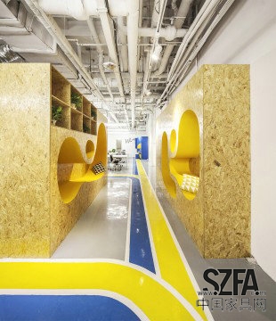 在辦公空間中,地下層往往會(huì)因?yàn)槠浣煌ǚ绞降牟槐愣哂辛觿?,在遠(yuǎn)洋新干線We+項(xiàng)目中,為了避免地下空間的不便,建筑師將通往地下的樓梯間整體噴成了明快的黃色,在具有強(qiáng)烈引導(dǎo)性的同時(shí)也激發(fā)了原本消極空間的活力。明黃色的樓梯間在地下層出口處打開,形成大臺(tái)階,作為該聯(lián)合辦公空間為入駐團(tuán)隊(duì)提供的小型宣講和活動(dòng)發(fā)布場地。地下層的公共部分還設(shè)置了“貓洞”空間和“睡眠艙”空間,供入駐團(tuán)隊(duì)交往、放松和短時(shí)休憩所用。