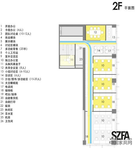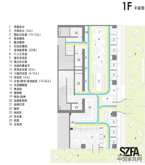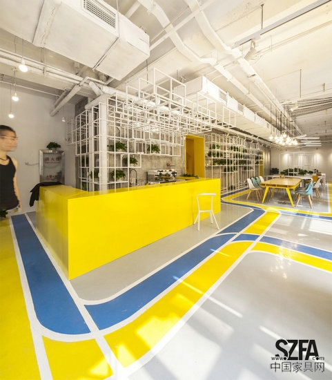空間的首層原為商鋪, 租金昂貴。為了回應(yīng)商業(yè)的需求,設(shè)計(jì)師除了在底層設(shè)置了提供服務(wù)和飲品的吧臺(tái)之外,在西側(cè)入口植入了相對(duì)獨(dú)立的零售區(qū)。零售區(qū)有獨(dú)立出入口,并通過家具組合與首層大空間分隔。在平時(shí)的使用中,該部分與大空間的吧臺(tái)連通,作為聯(lián)合辦公空間的一部分,此時(shí),零售區(qū)的三角桌可以單個(gè)使用,也可以拼合成會(huì)議、團(tuán)隊(duì)工作等等;在早晨和周末等特定的時(shí)期,這里還可以作為短時(shí)零售以及展示活動(dòng)使用,成為小型創(chuàng)業(yè)團(tuán)隊(duì)產(chǎn)品展示推廣活動(dòng)的絕佳場所。
