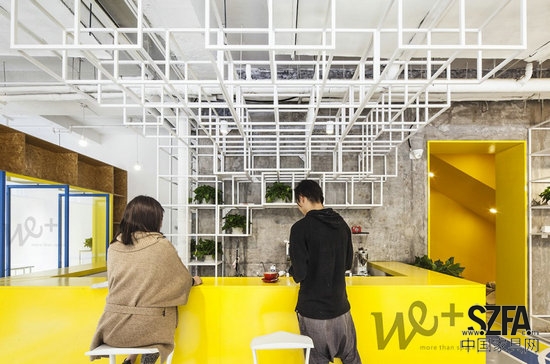 除了“圖書館”式的體驗(yàn)之外,該聯(lián)合辦公空間還采取了“展覽”的方式進(jìn)行設(shè)計(jì):聯(lián)合辦公空間的入駐者多為創(chuàng)業(yè)階段的中小型團(tuán)隊(duì),團(tuán)隊(duì)的產(chǎn)品、發(fā)布、展示、乃至銷售也是進(jìn)行此類空間設(shè)計(jì)時(shí)需要考慮的功能要求。于是,建筑師在首層植入了四個(gè)展示模塊單元和一整面的展示墻為創(chuàng)業(yè)團(tuán)隊(duì)提供展示空間。此時(shí),聯(lián)合辦公不僅僅是辦公團(tuán)隊(duì)的入駐,也可以是創(chuàng)業(yè)團(tuán)隊(duì)產(chǎn)品的入駐。