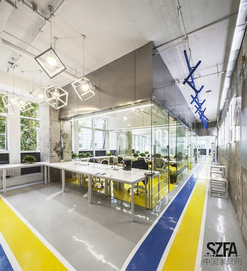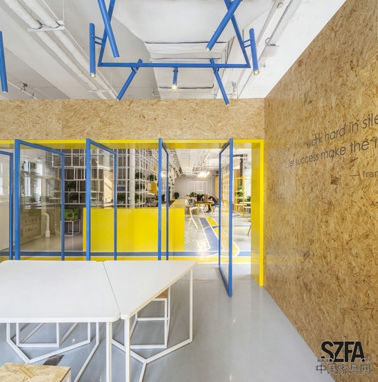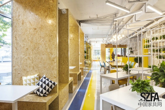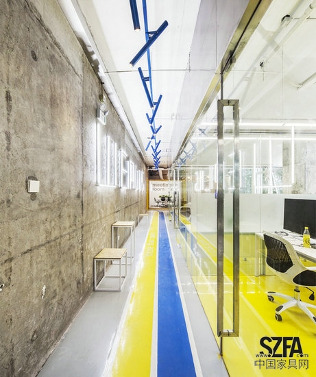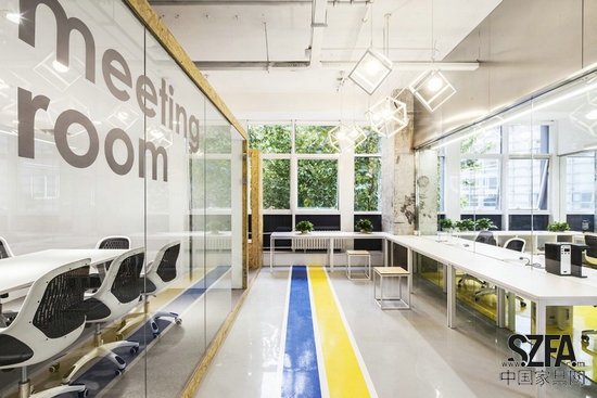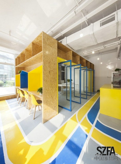 空間建構(gòu)上,建筑師通過植入小盒子的方式來界定該辦公空間中更為私密的會(huì)議室和辦公隔間:歐松板家具組合限定了位于二層和地下層的會(huì)議室空間;而獨(dú)立辦公隔間則是由兩米四高的透明玻璃分隔而成。隔間內(nèi)采用明亮顏色的地面也加強(qiáng)了“植入”這一概念的表達(dá),同時(shí),這種與原有墻體分離的植入家具的設(shè)計(jì)方式也從另一面暗示了聯(lián)合辦公空間的即時(shí)性、靈活性和可變性。