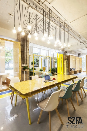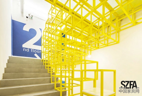 空間首層作為“展示”的建造語言被向上延伸:通往二層獨(dú)立辦公區(qū)的樓梯間被懸吊的黃色鋼架填充,鋼架在提供了樓梯間圍護(hù)結(jié)構(gòu)的同時(shí),還在樓梯間頂部產(chǎn)生了一個(gè)小小的半透明冥想空間,用來幫助入駐團(tuán)隊(duì)打開腦洞,這同時(shí)也成為了該聯(lián)合辦公空間設(shè)計(jì)中的一大亮點(diǎn)。